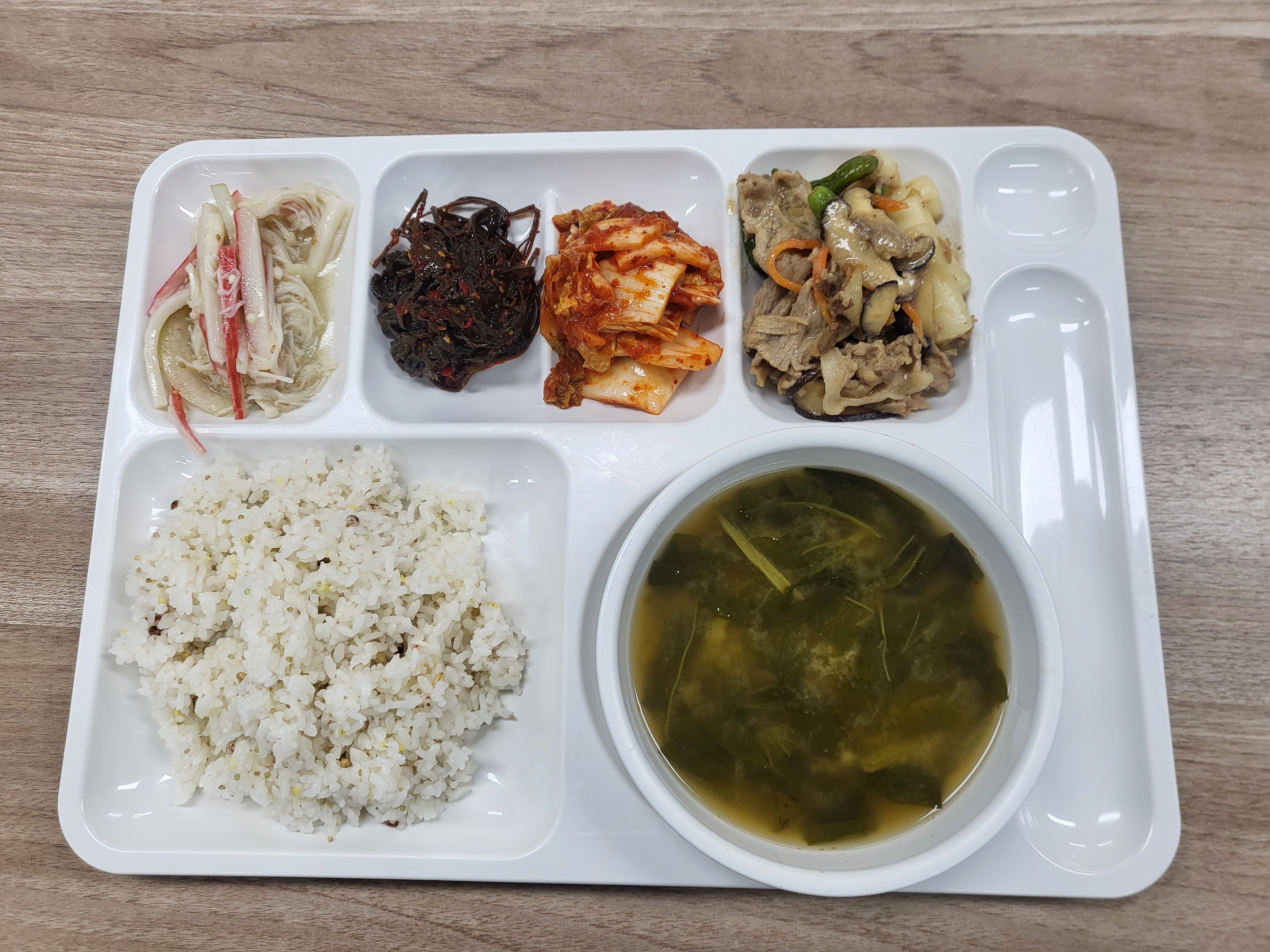 쌀(국내산), 김치(배추,고추가루:중국산), 두부(대두:외국산), 콩비지(대두:외국산), 소고기(호주산), 돼지고기(국내산), 닭고기(국내산), 건새우(중국산), 조기(중국산), 종합어묵(연육:외국산), 새우까스(새우살:중국산), 재첩살(중국산), 코다리(러시아산), 닭다리살(브라질산), 오징어(중국산), 북어채(러시아산), 추어탕(미꾸라지:국내산)