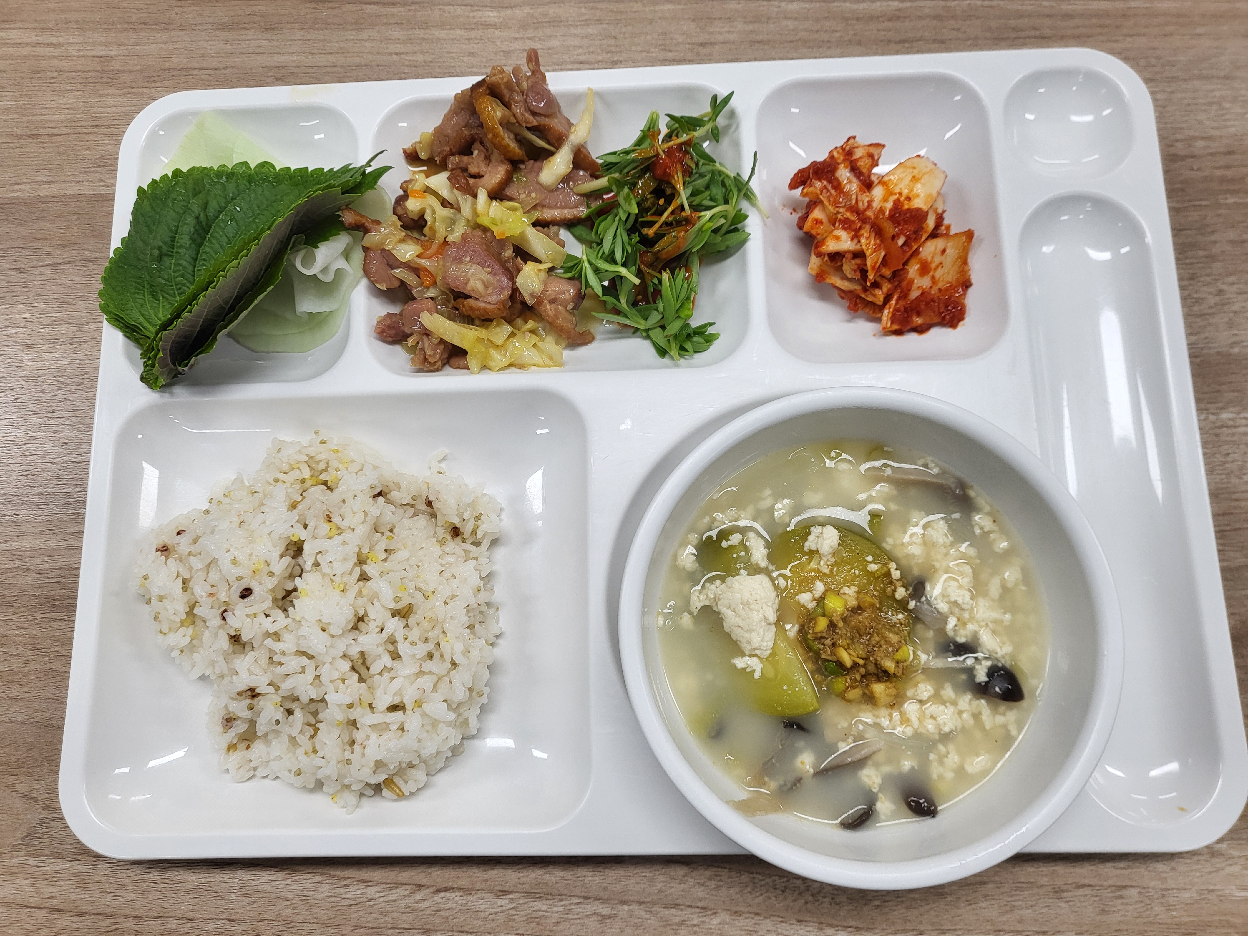 쌀(국내산), 김치(배추,고추가루:중국산), 두부(대두:외국산), 콩비지(대두:외국산), 소고기(호주산), 돼지고기(국내산), 닭고기(국내산), 북어채(러시아산), 차돌박이(미국산), 훈제오리(중국산), 탕수육(돈육:국내산), 바지락살(중국산), 미트볼(계육:국내산), 임연수(외국산),우렁살(국내산)